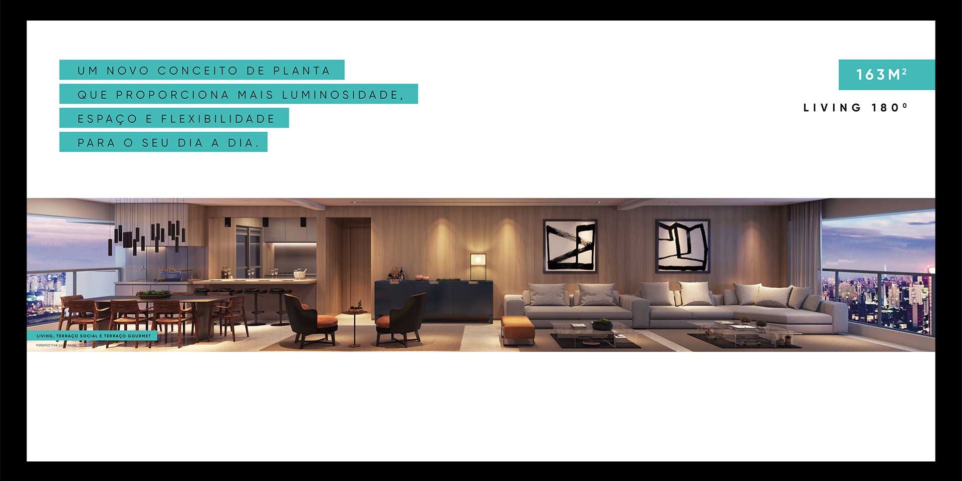 Ao estudar o lançamento em detalhes, conhecer também outros pontos relevantes, como o apartamento com 2 terraços. Isso seria apenas um número em uma comunicação comum que não é transformada no Living 180 Graus . Um forte conceito que chama atenção para a vista única e a iluminação fornecida por essas duas áreas abertas - uma em cada elemento da planta, porém conectado pela sala ampla.