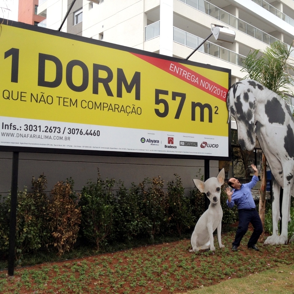 A escolha dos cachorros como garotos-propaganda mostra que, mesmo sendo da mesma espécie, pode existir uma diferença tão grande no porte que qualquer comparação deixa de fazer...