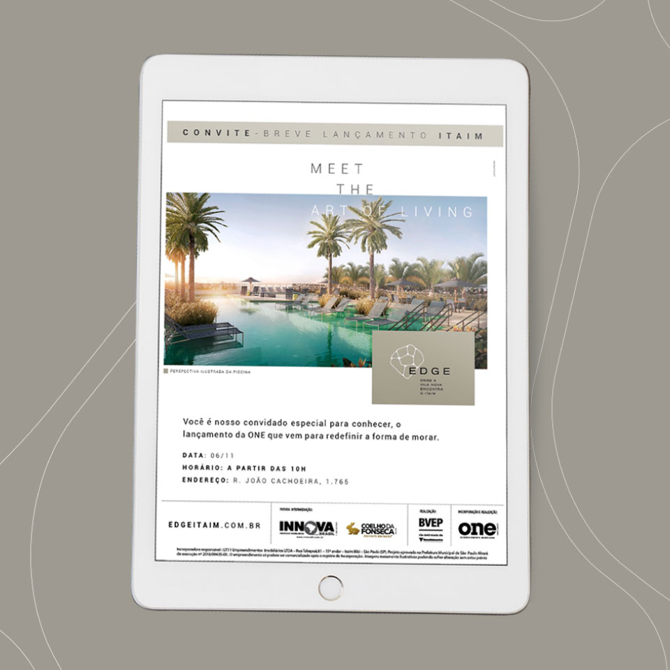 Se depender do lançamento da ONE que participamos no fim do ano passado, 2019 começa com ótimas expectativas. O EDGE já está 80% vendido e tem lista de espera para algumas de suas unidades. A comunicação que realizamos foi bem específica, jogando luz sobre insights que só existem nesse projeto, relacionados ao logo, naming, materiais integrados, entre outros.