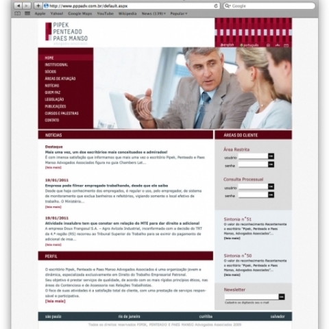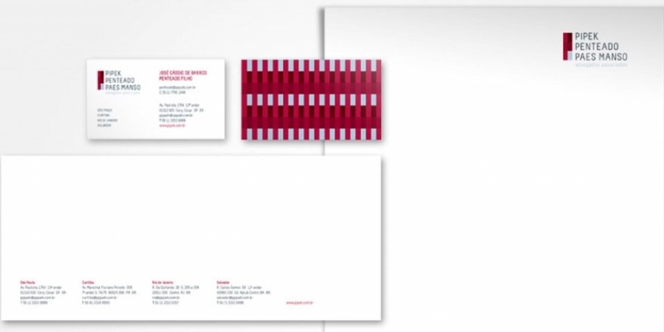 Com mais de 200 associados em São Paulo, Curitiba, Rio de Janeiro e Salvador, o Pipek, Penteado e Paes Manso é o maior escritório especializado em advocacia trabalhista patronal do País. Nosso briefing era criar uma identidade que refletisse o perfil jovem e moderno dos sócios e a visão contemporânea das ações e relações – internas e externas – da companhia. Nosso insight partiu da divisão operacional do escritório, com seis áreas de atuação, e das iniciais dos sobrenomes dos principais sócios, símbolo do logo anterior.