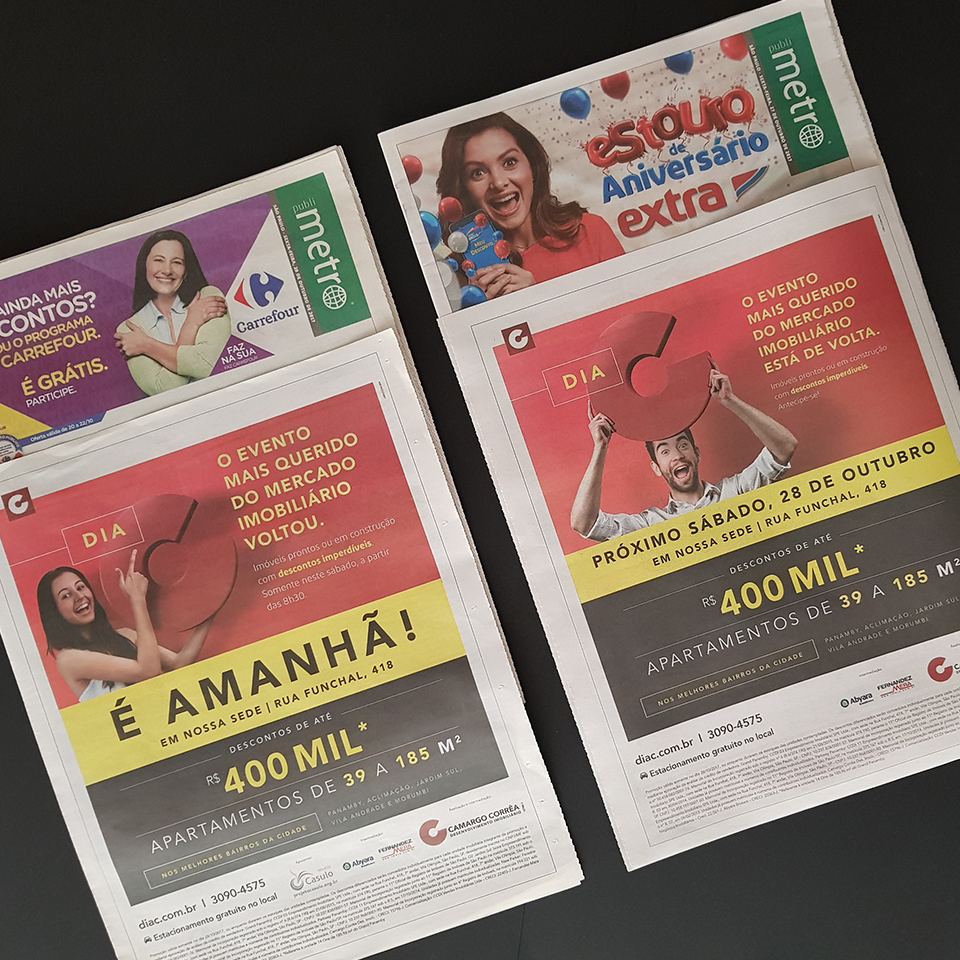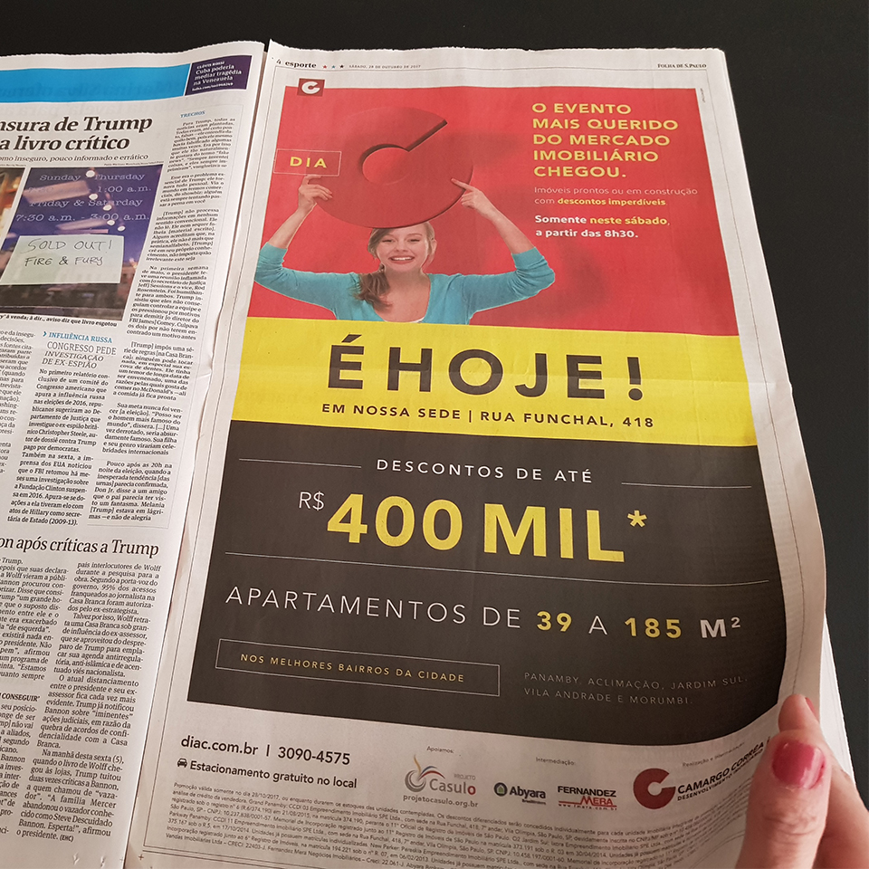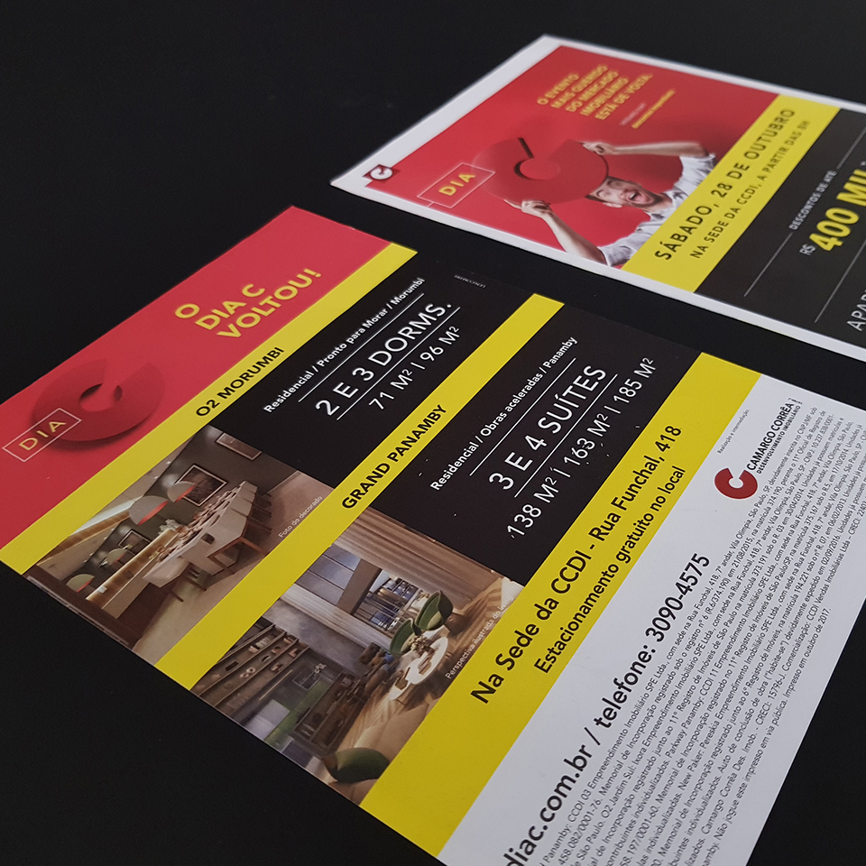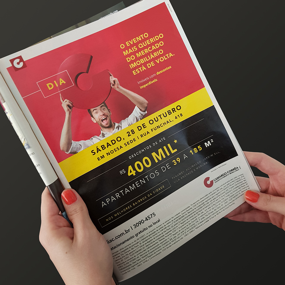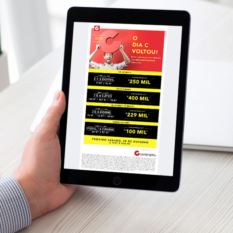 A comunicação que definimos como “varejo elegante” e a assinatura, que é, ao mesmo tempo, um anúncio para os clientes e um grito de guerra para os corretores – “O Dia C voltou!” –, ajudaram a engajar as equipes comerciais e a atrair centenas de pessoas para realizar o sonho de comprar um imóvel. Realizado na sede da CCDI pela primeira vez, o evento disponibilizou apartamentos novos de 39 a 185 metros quadrados, com descontos de até R$ 400 mil.