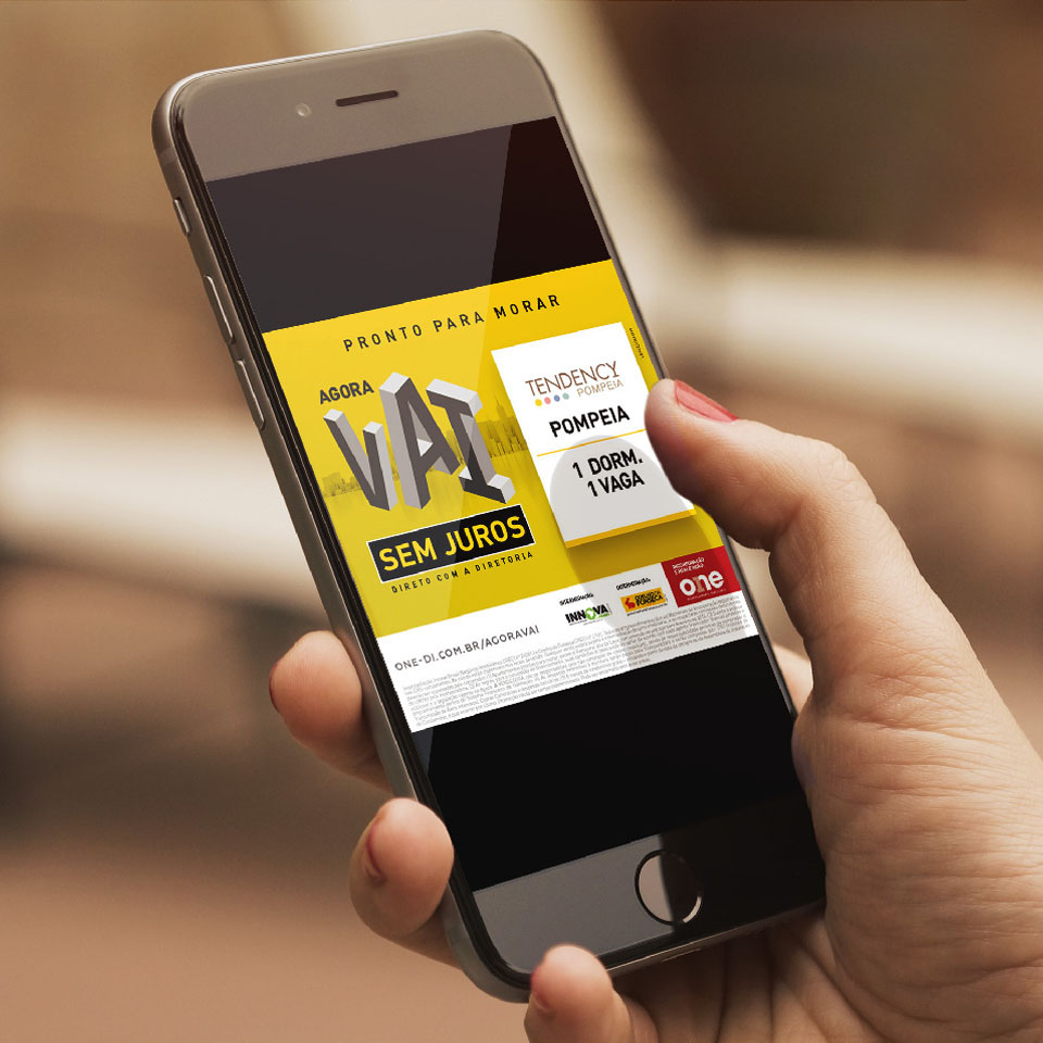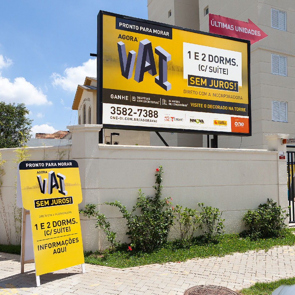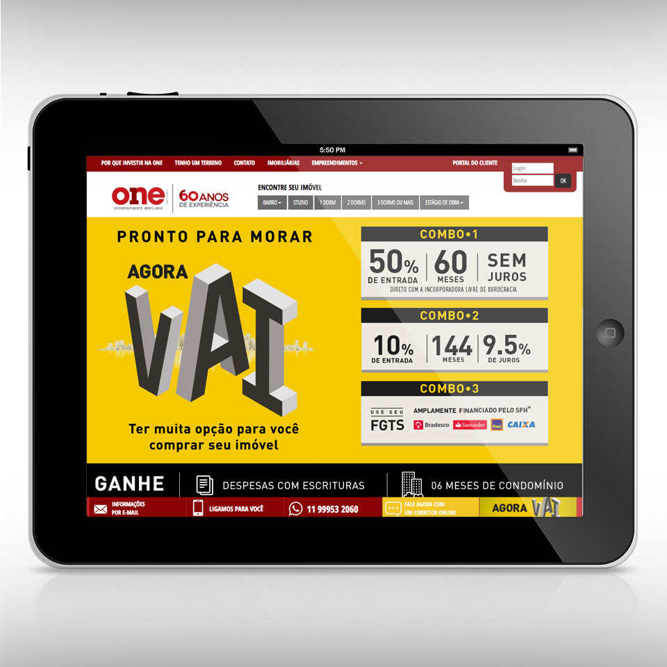 Por falar em web, o site da ONE Desenvolvimento Imobiliário foi completamente embalado com a identidade da campanha. Na página principal, a foto de cada um dos sete empreendimentos participantes ganhou o selo exclusivo “Agora Vai”. Além disso, as cores da promoção predominam ao lado do tradicional vermelho da ONE, evidenciando para o público que há algo diferente no ar.