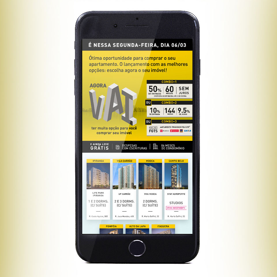 Nessa linha, o “Agora vai” aproveita para promover as unidades em estoque. A comunicação dá destaque aos três combos oferecidos ao cliente, que possibilitam diferentes formas de pagamento, facilitando a aquisição do imóvel. A venda de estoque, aliás, se tornou uma das nossas maiores especialidades e incluem estratégias integradas, que vão de ações analíticas digitais passando por criação e conteúdo até planejamento de mídia e internet.