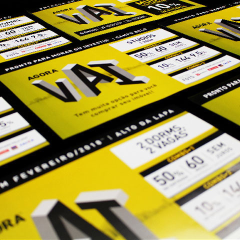 Nos layouts, as fontes usadas na palavra “Vai” são cinzas e remetem a pilares e vigas de concreto. O amarelo é chamativo e impacta, o que dá forte apoio às ações digitais. Como a maioria dos sites tem fundo claro, a cor funciona muito bem, saltando aos olhos.