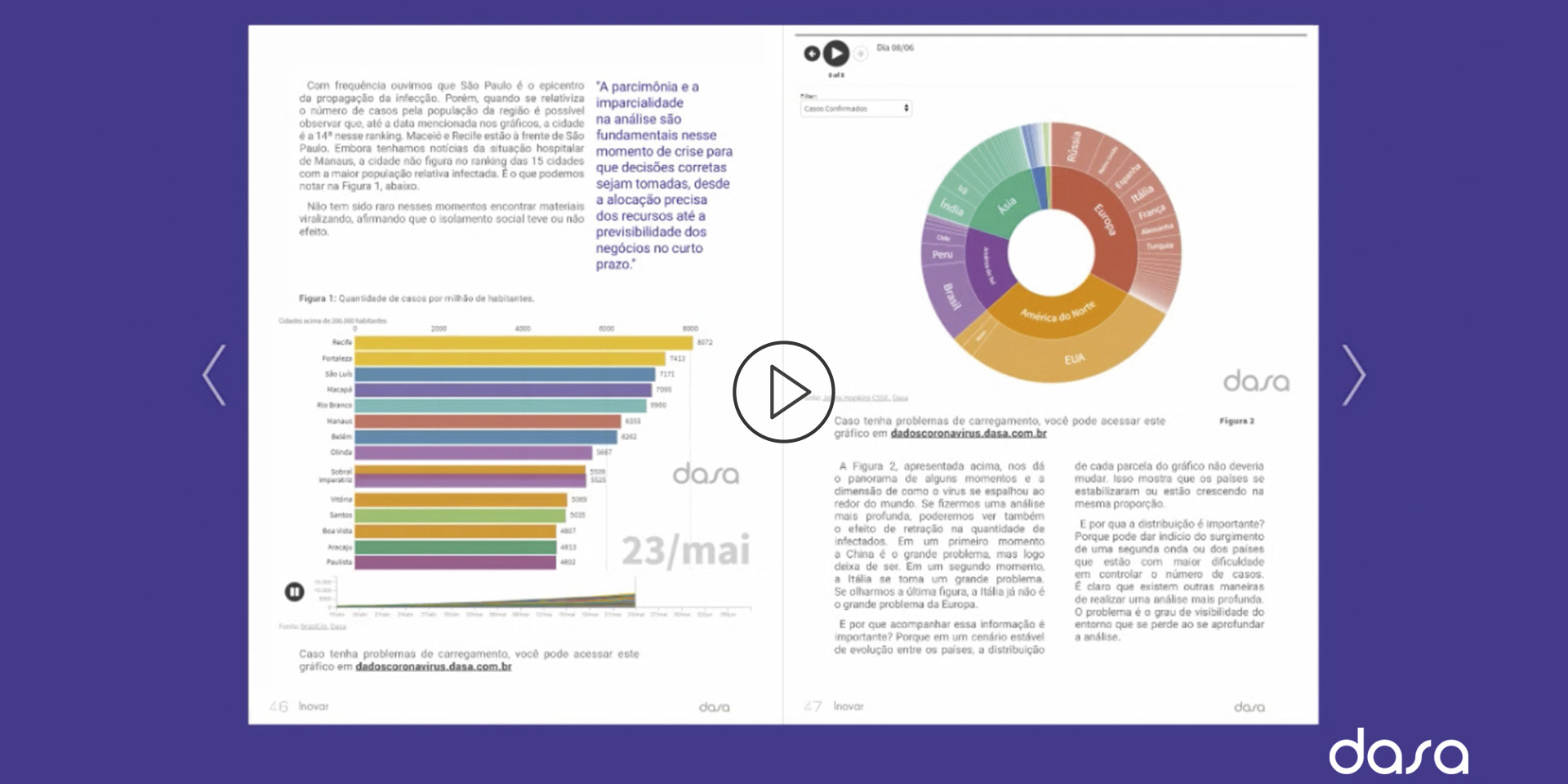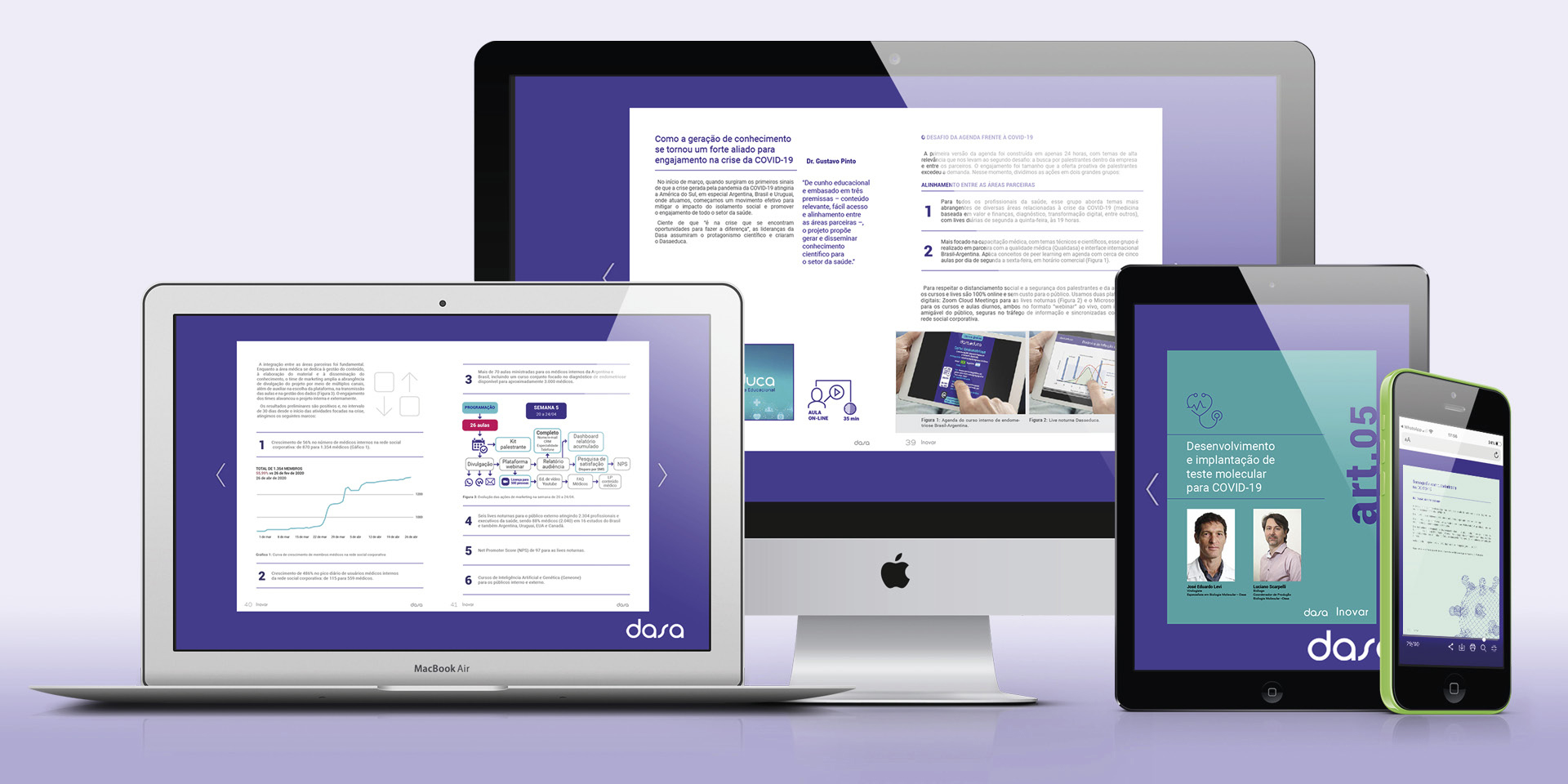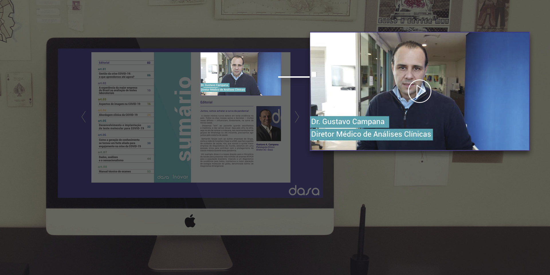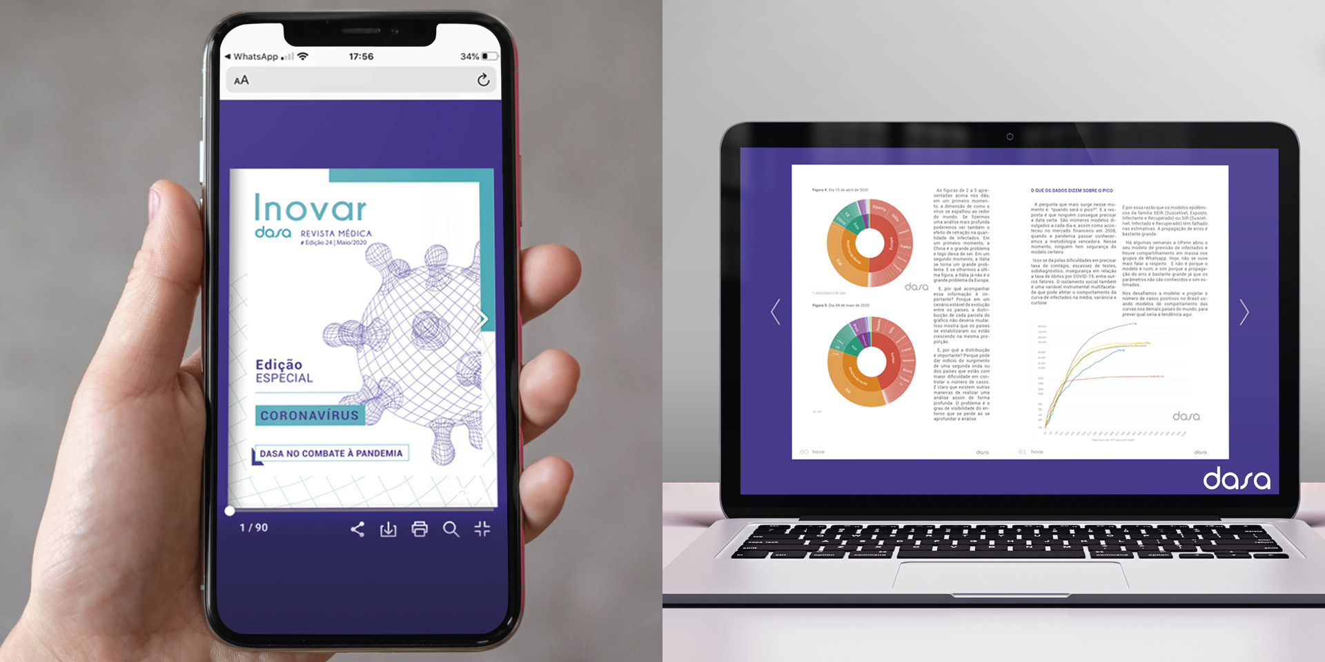 Um projeto importante que acaba de ser lançado é a publicação tradicional Dasa Inovar. Voltada para médicos e com amplo alcance no mercado, foi toda reformulada. Uma nova versão 100% online substituiu o exemplar impresso e foi pensado para trazer um conteúdo rico com recursos de interatividade e multimídia. Vídeos depoimentos, vídeos da plataforma Dasa Educa, gráficos e conteúdos dinâmicos com os quais o leitor pode interagir, recriam uma experiência de leitura, agora mais atraente, participativa e acessível aos dispositivos móveis.