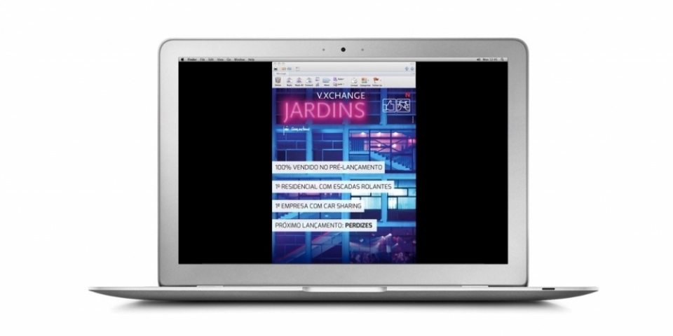 Neste caso, a ideia foi utilizar as escadas rolantes da entrada, que formam um X e dão acesso ao lounge, como parte do nome do empreendimento e elemento icônico da campanha. Já as imagens e as cores...